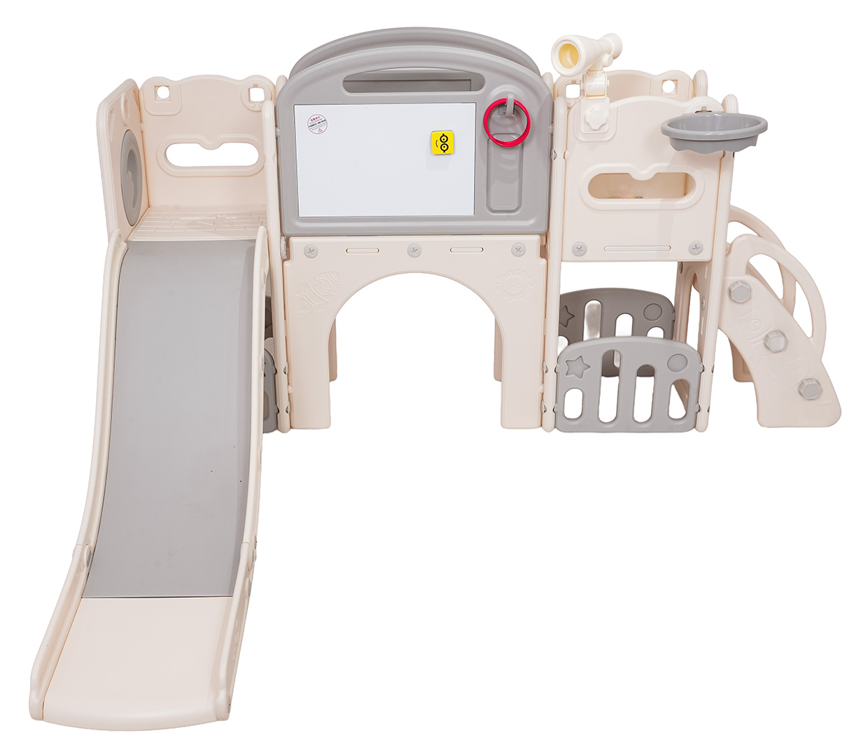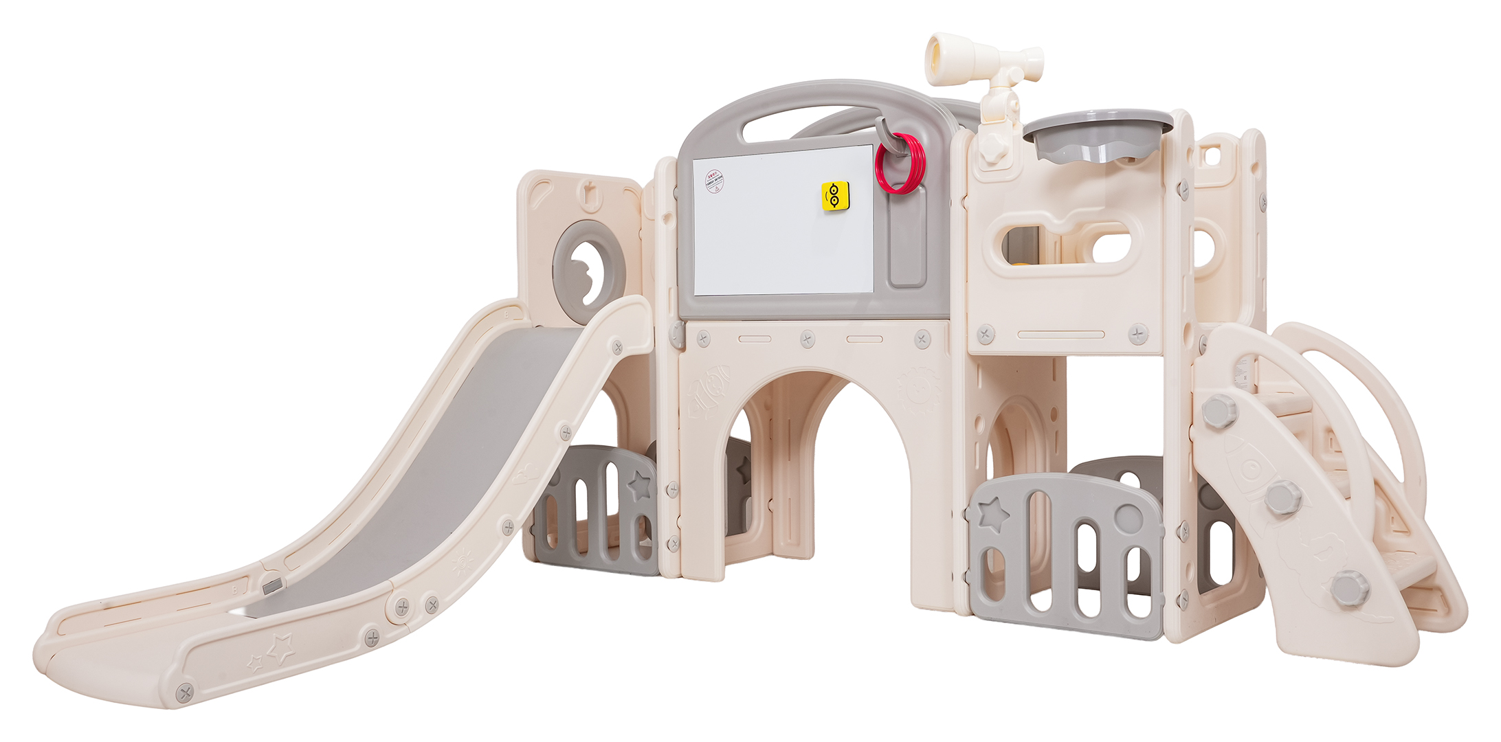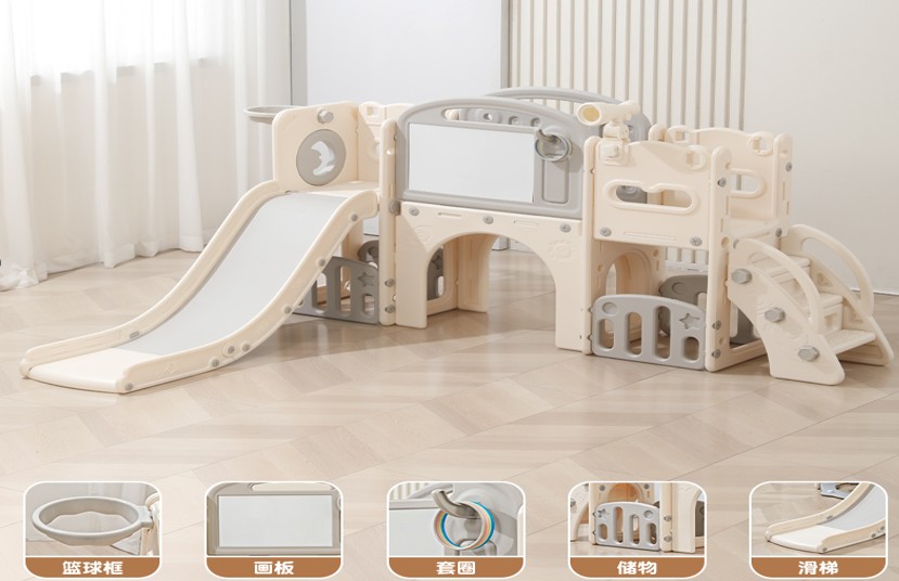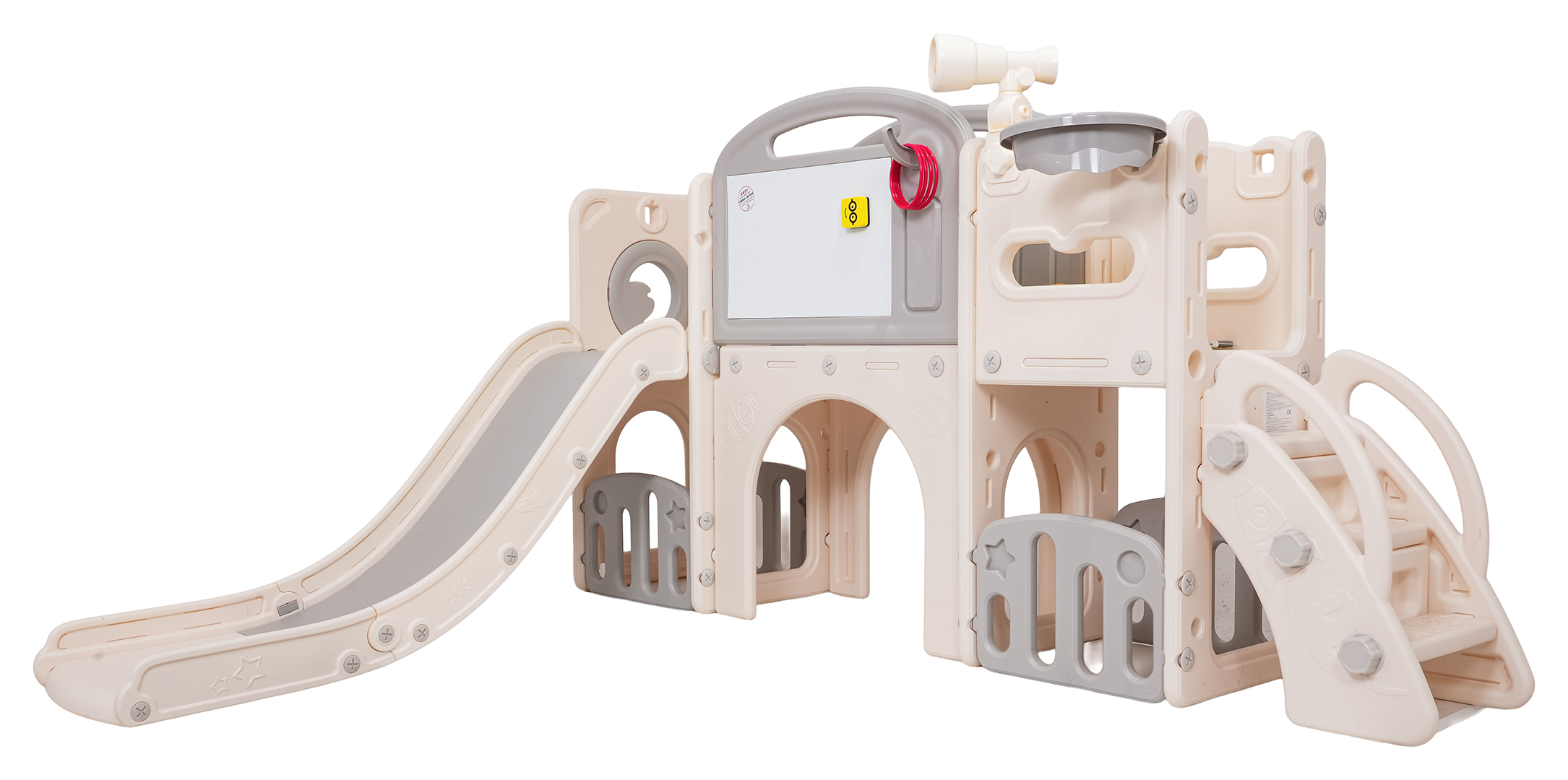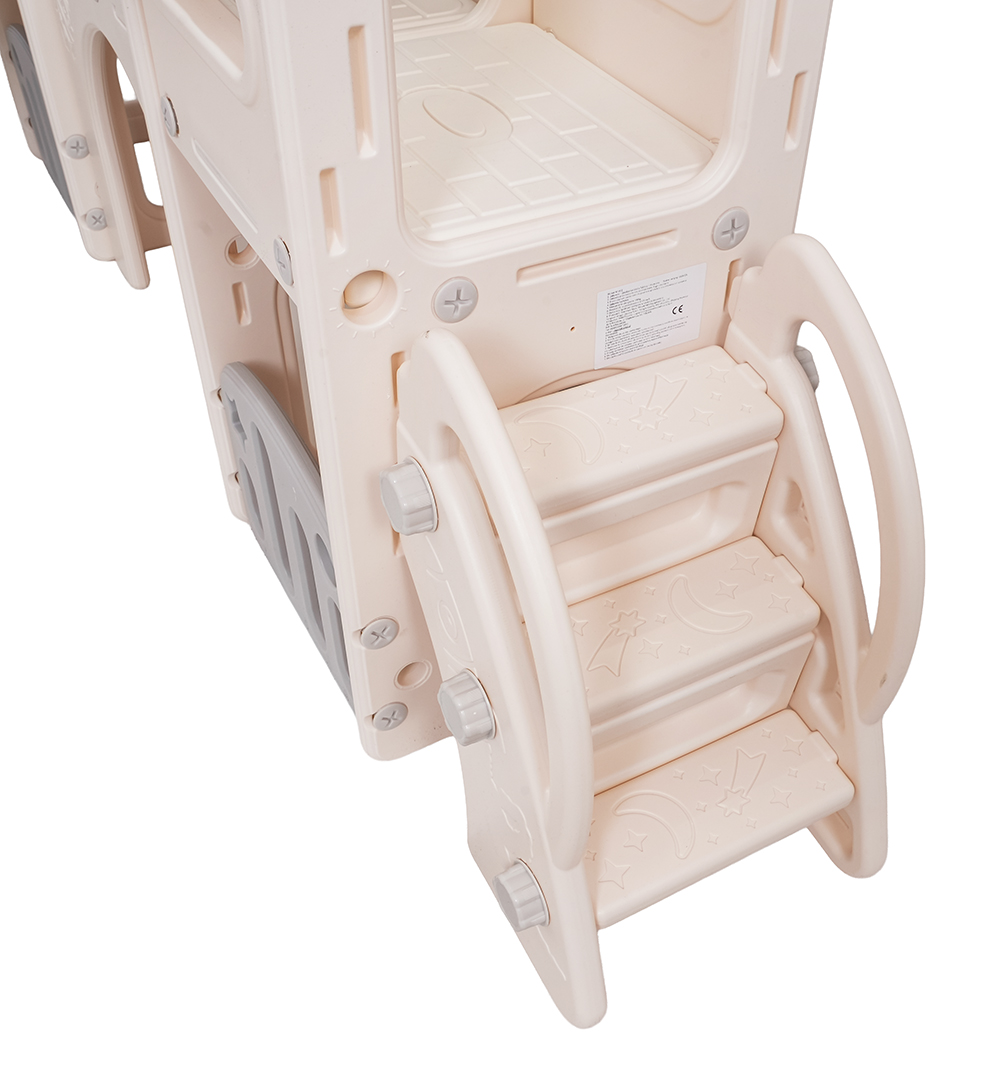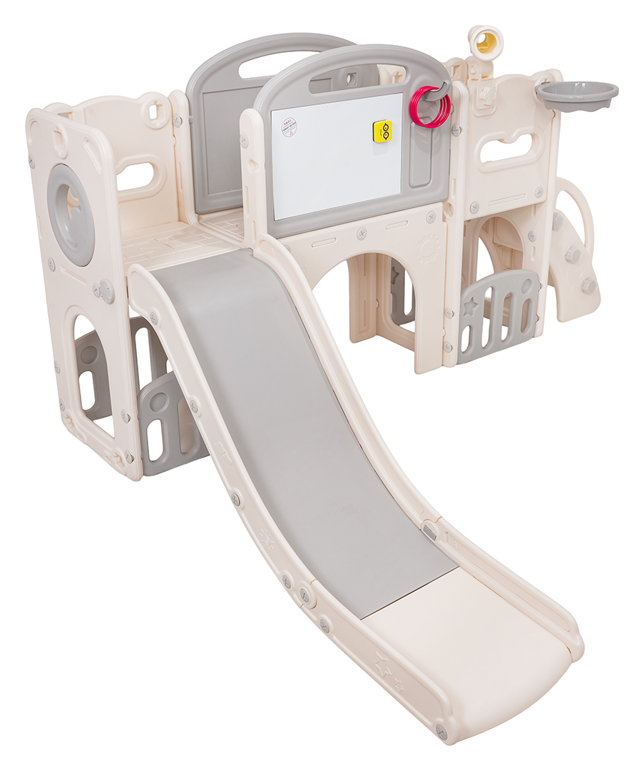 Ovaj 5-u-1 set uključuje tobogan, košarkašku loptu, ploču za crtanje, igru bacanja prstenova i gol, prikladan za djecu od 1 godine i više. Sve komponente izrađene su od visokokvalitetnog HDPE-a, koji je fleksibilniji i otporniji na mehanička oštećenja od drugih sličnih konstrukcija. Velike komponente olakšavaju sastavljanje. Set je idealan za unutarnju i vanjsku upotrebu.