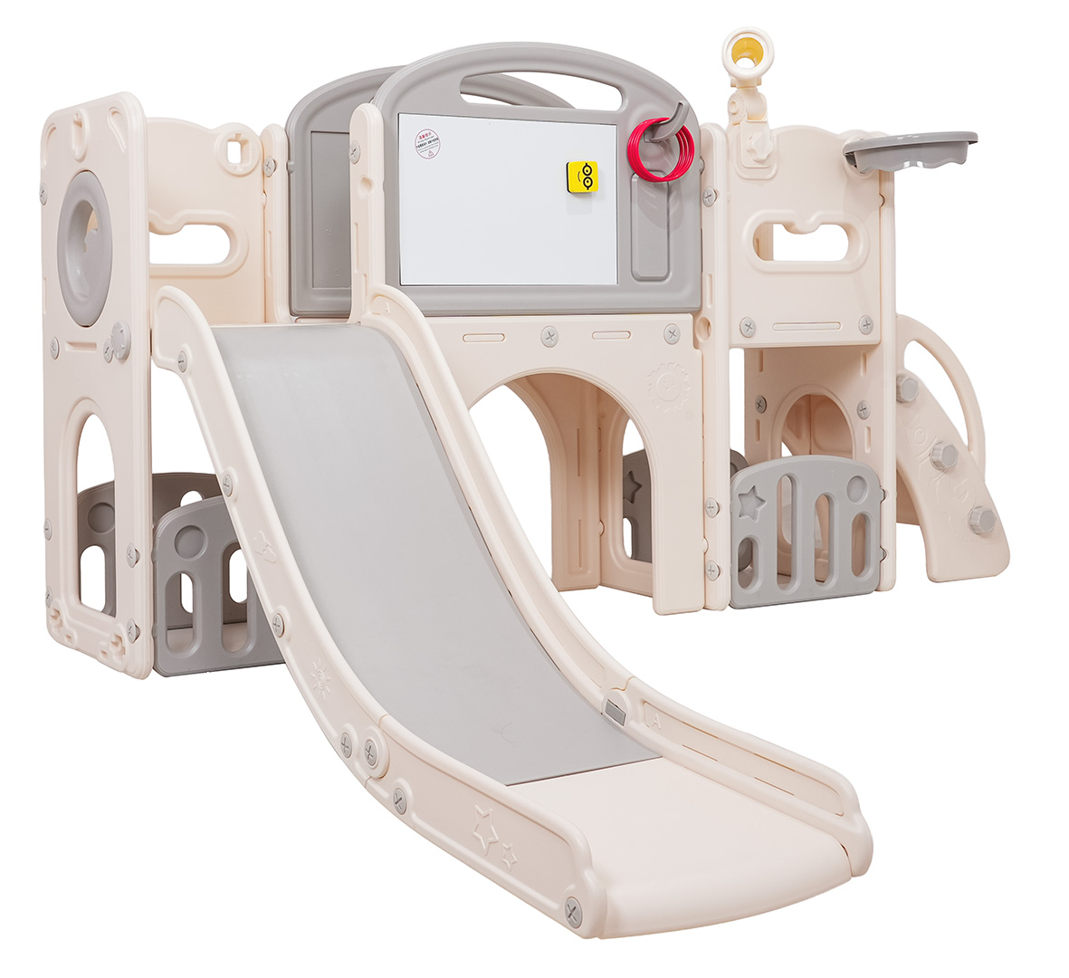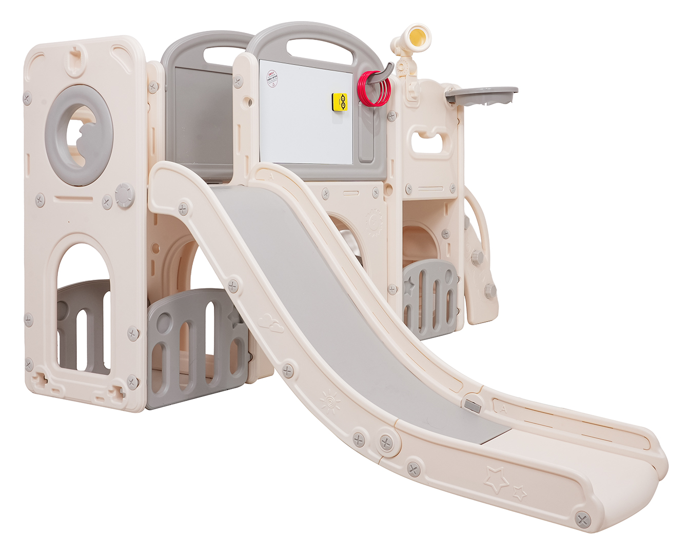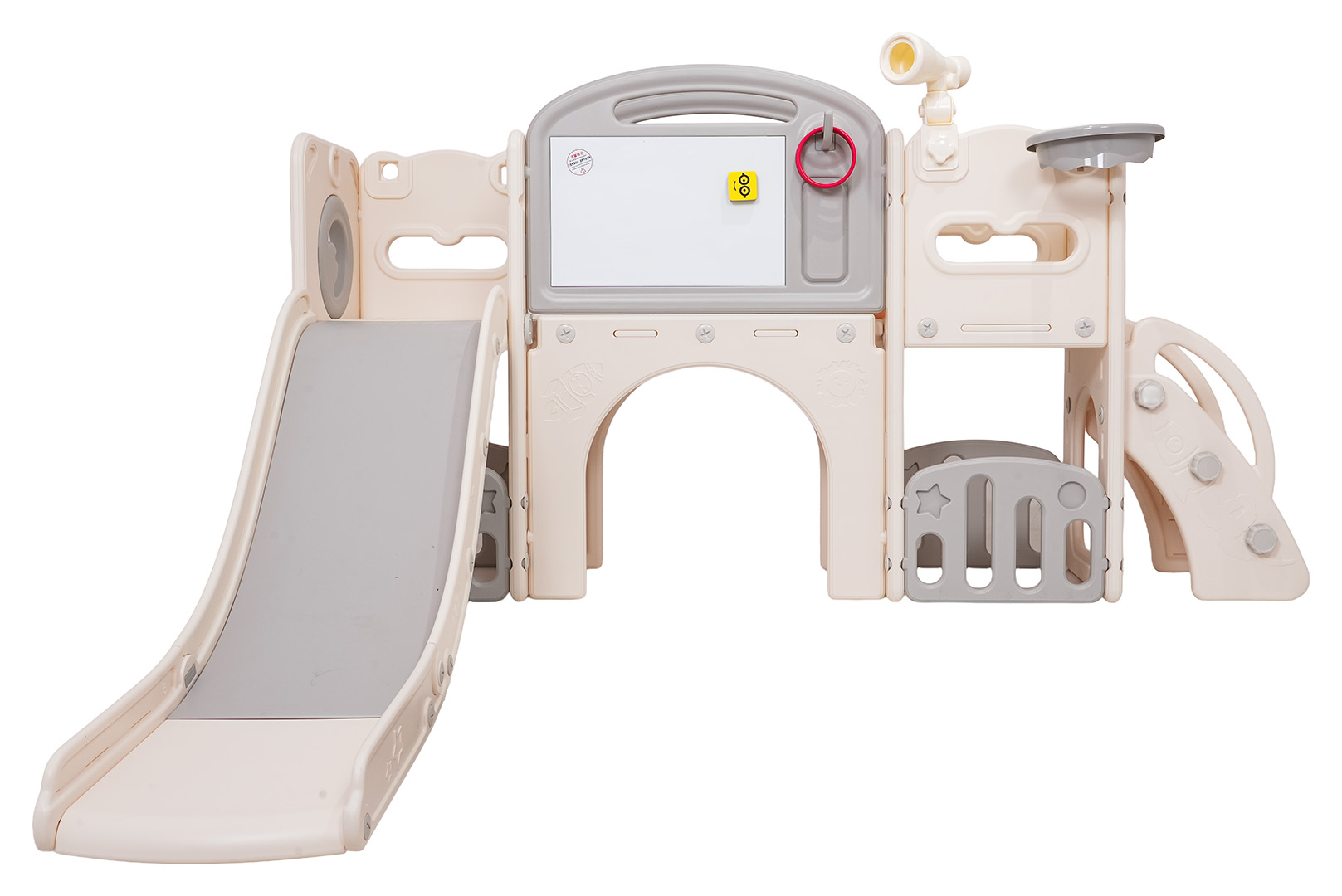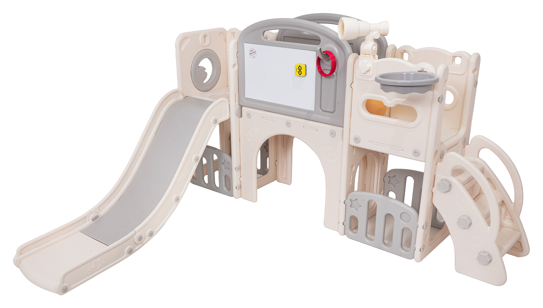 Ovaj 5-u-1 set uključuje tobogan, košarkašku loptu, ploču za crtanje, igru bacanja prstenova i gol, prikladan za djecu od 1 godine i više. Sve komponente izrađene su od visokokvalitetnog HDPE-a, koji je fleksibilniji i otporniji na mehanička oštećenja od drugih sličnih konstrukcija. Velike komponente olakšavaju sastavljanje. Set je idealan za unutarnju i vanjsku upotrebu.