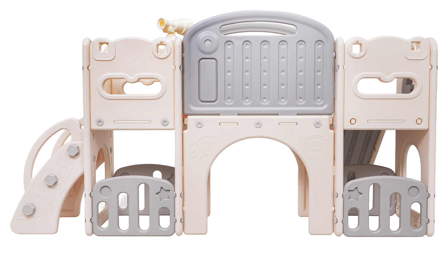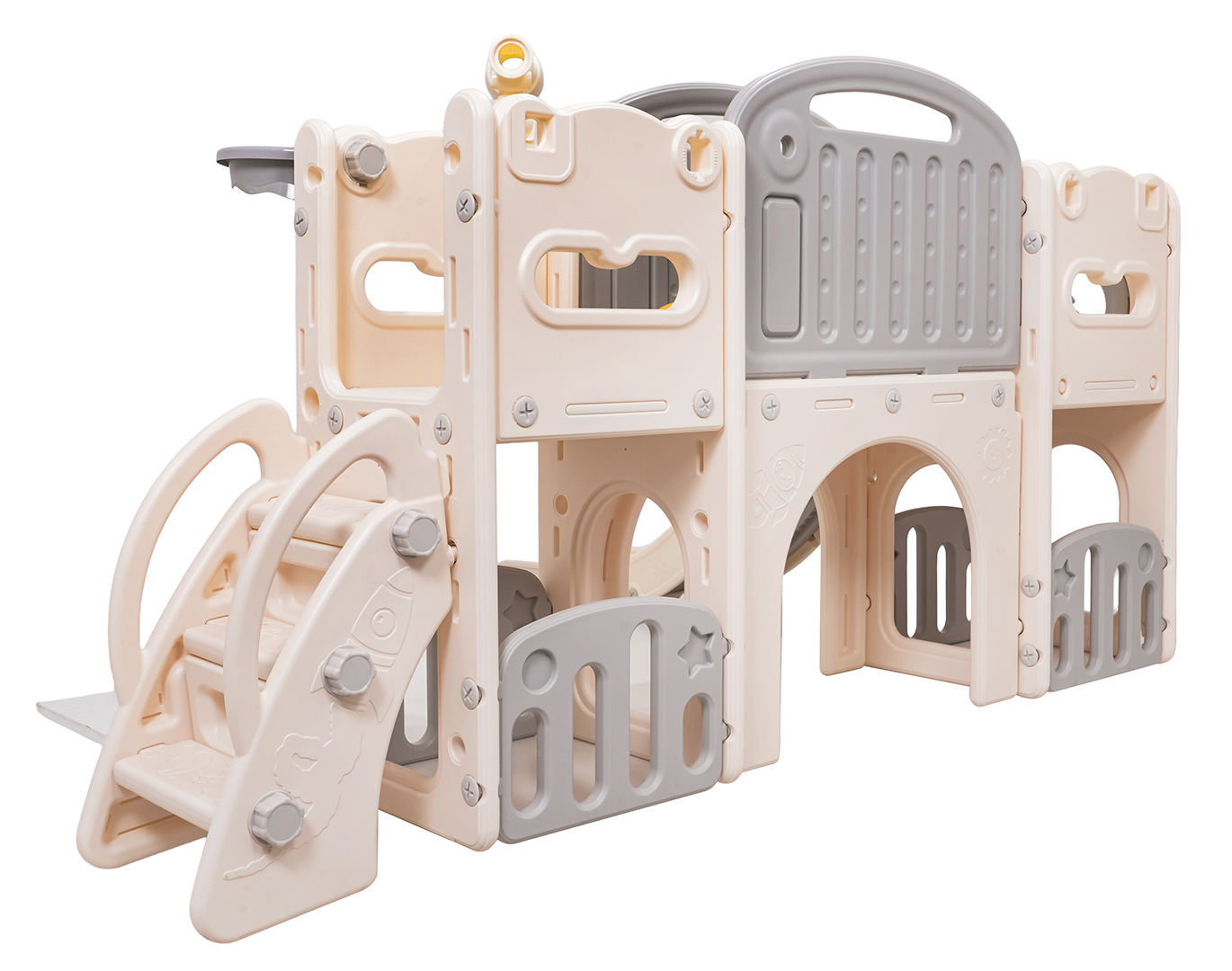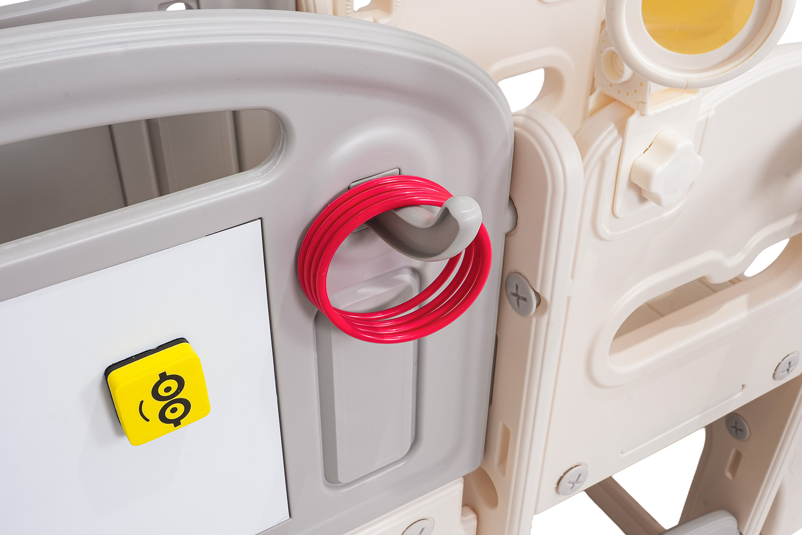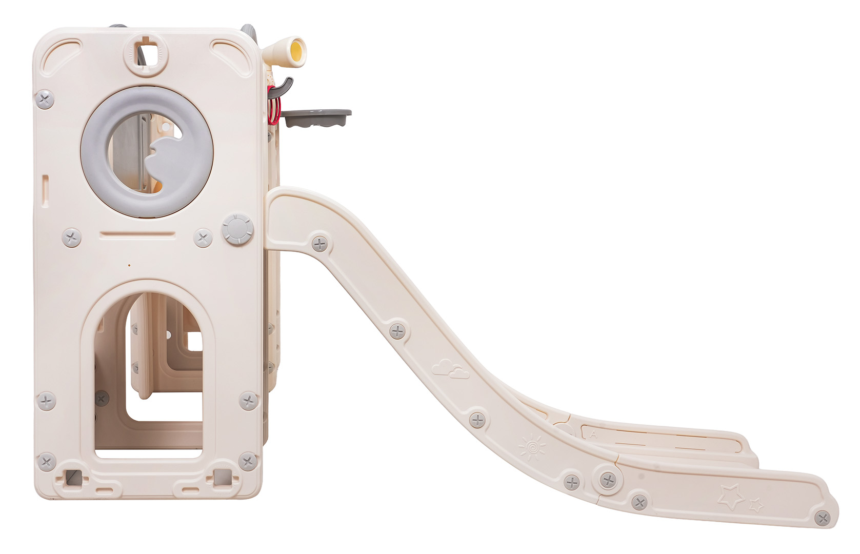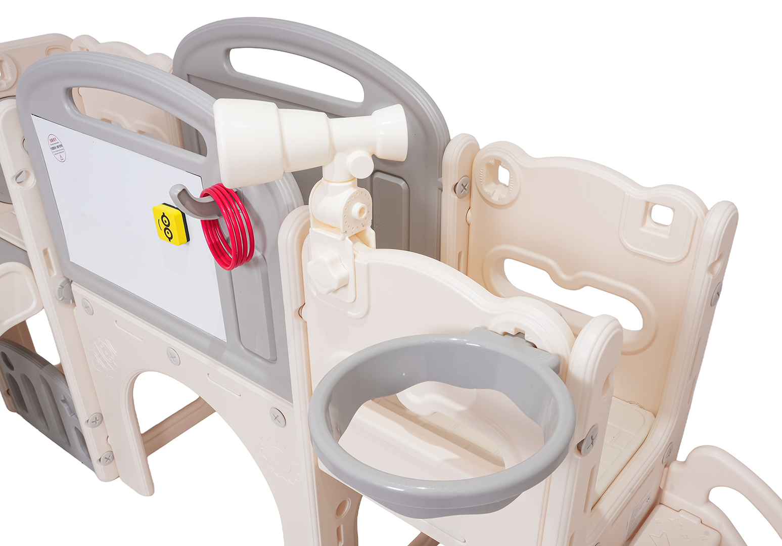 Ovaj 5-u-1 set uključuje tobogan, košarkašku loptu, ploču za crtanje, igru bacanja prstenova i gol, prikladan za djecu od 1 godine i više. Sve komponente izrađene su od visokokvalitetnog HDPE-a, koji je fleksibilniji i otporniji na mehanička oštećenja od drugih sličnih konstrukcija. Velike komponente olakšavaju sastavljanje. Set je idealan za unutarnju i vanjsku upotrebu.
