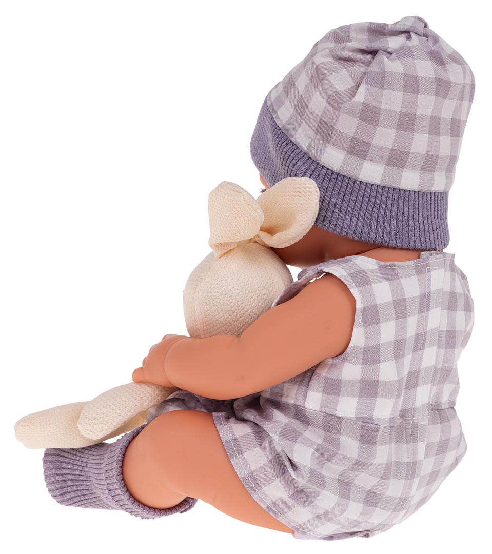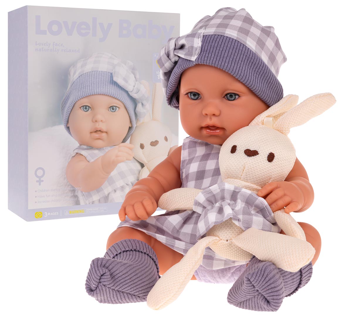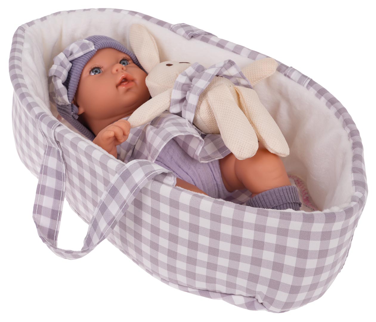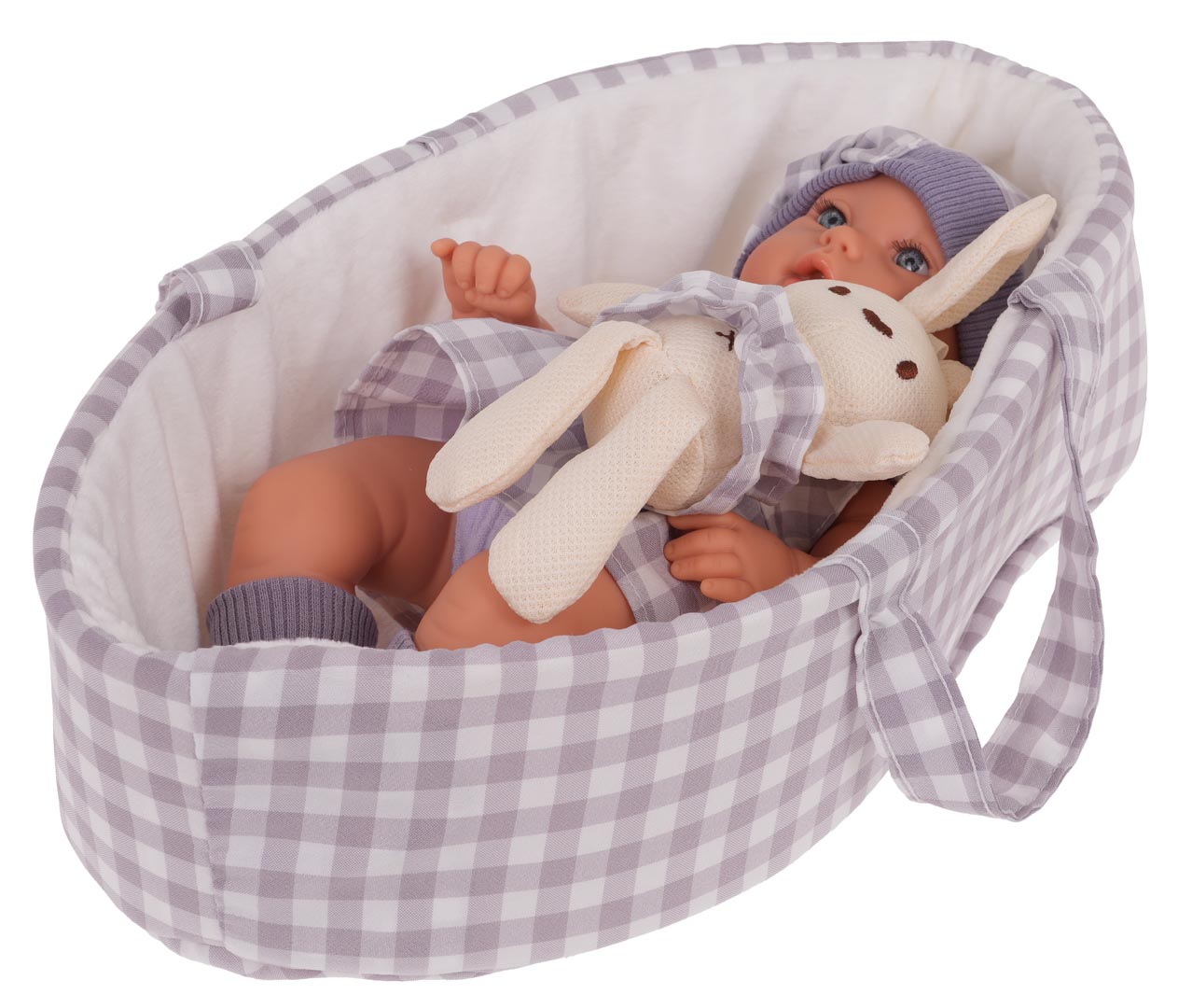 Lutka s dodacima za djecu od 3 godine i više. Set uključuje preslatku bebu u haljini s plišanom igračkom zečića i košarom za nošenje kako bi je vaš mališan mogao ponijeti bilo gdje. Lutka je savršeno izrađena, s pažnjom posvećenom svakom detalju i potpuno je sigurna za djecu. Ima haljinu, kapu, gaćice i čarape koje se mogu skinuti. Pomične noge i ruke olakšavaju oblačenje. Igračka potiče motorički razvoj vašeg djeteta.