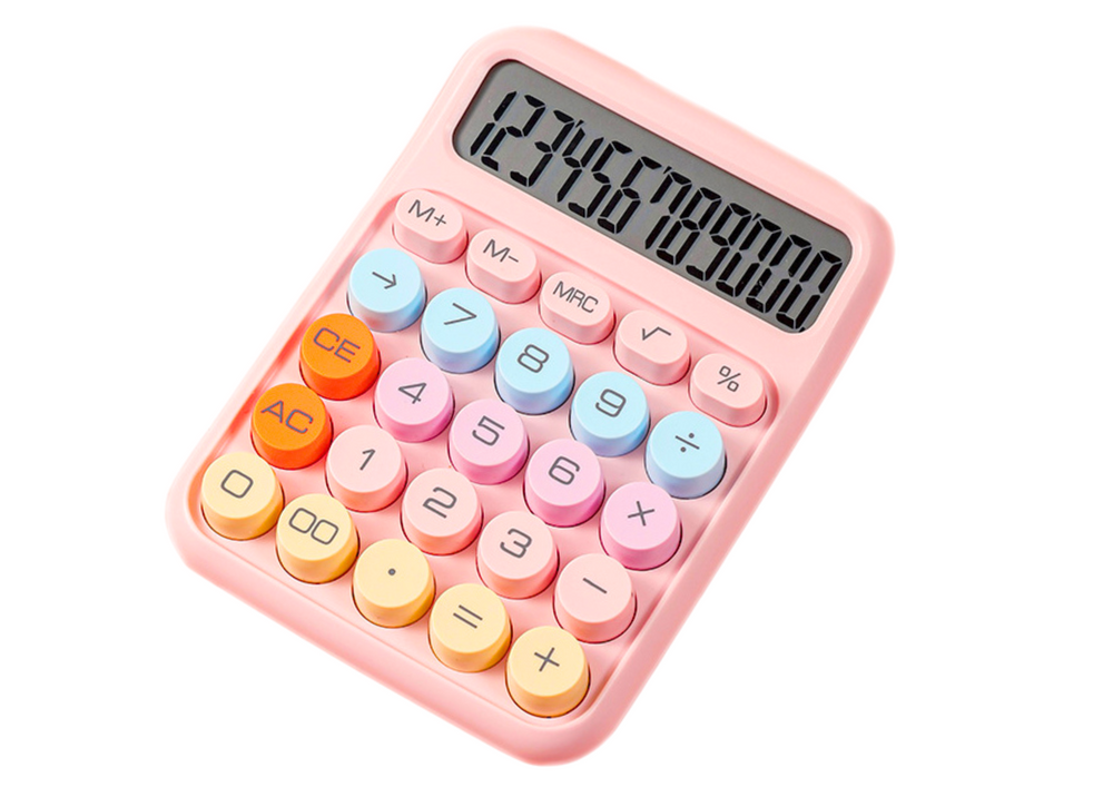 The calculator is pink, which gives it an elegant and modern look. The device has large, comfortable keys in different colors: pink, blue, yellow and orange, which facilitates quick and intuitive data entry.
