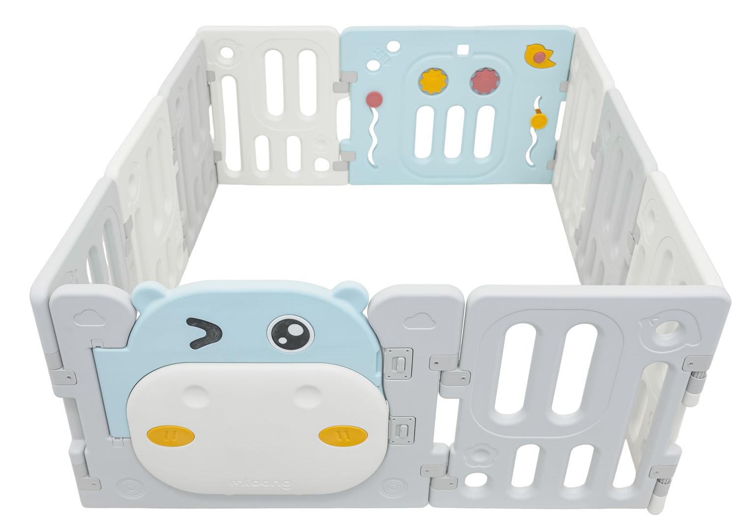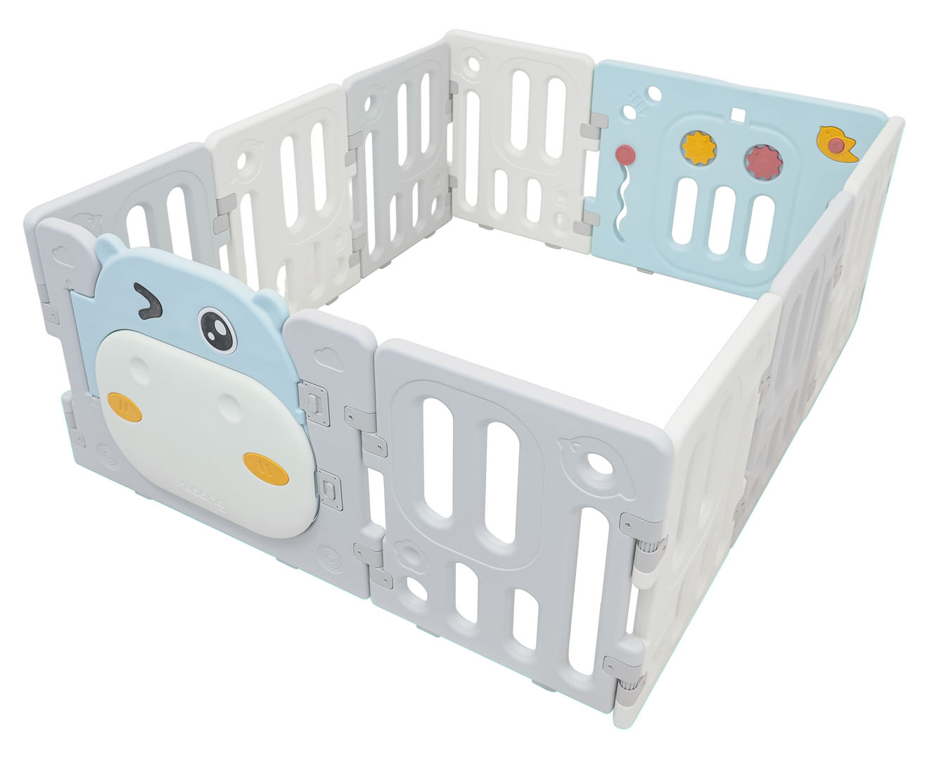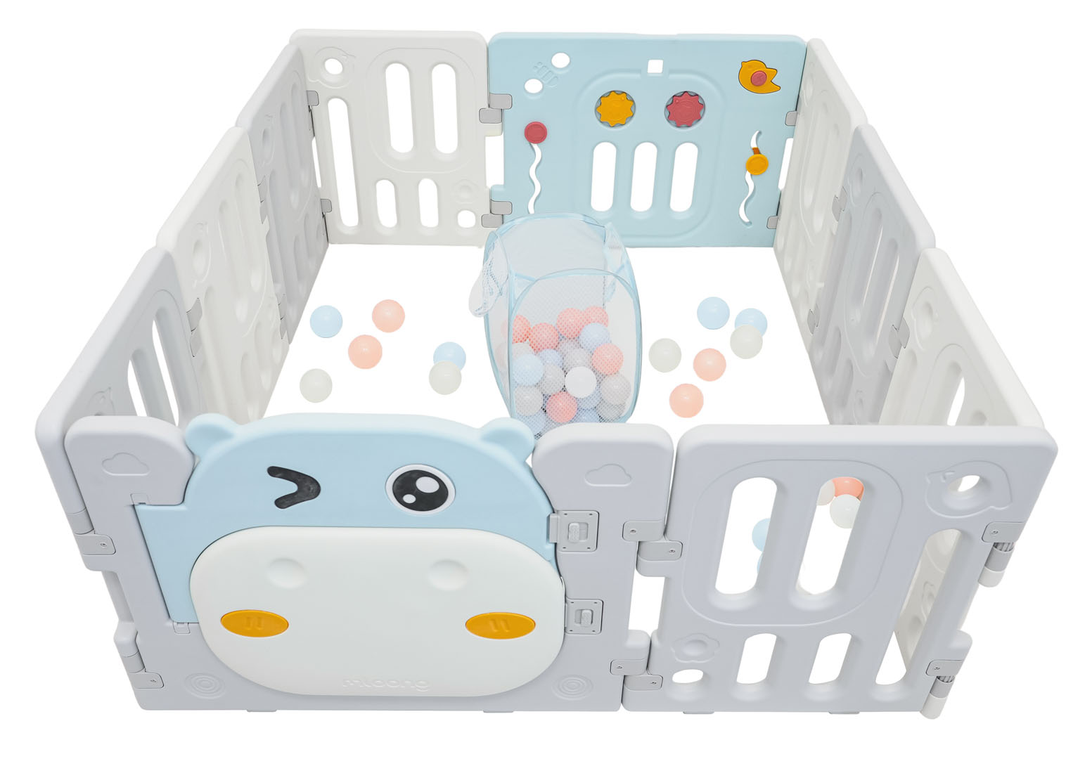 Veliko, praktično, sklopivo modularno igralište za dijete od 6 mjeseci starosti. Od igrališta možemo složiti bilo koju strukturu, prema vlastitim željama, vrlo se lako sklapa i rasklapa, stabilno je i ima glatke rubove. Unutrašnjost igrališta opremljena je manipulativnim elementima poput kliznog kotačića, zupčanika, zviždaljke ili volana. Set je izrađen od izdržljivih i netoksičnih materijala, sastoji se od 10 panela. Panel vrata se zaključava, sprječavajući dijete da otvori vrata izvana. Neklizajuće nožice sprječavaju klizanje igrališta. U igralištu će vaša beba imati dovoljno prostora za slobodno kretanje, a istovremeno će biti sigurna. Set također uključuje košaru za loptice i 40 loptica.