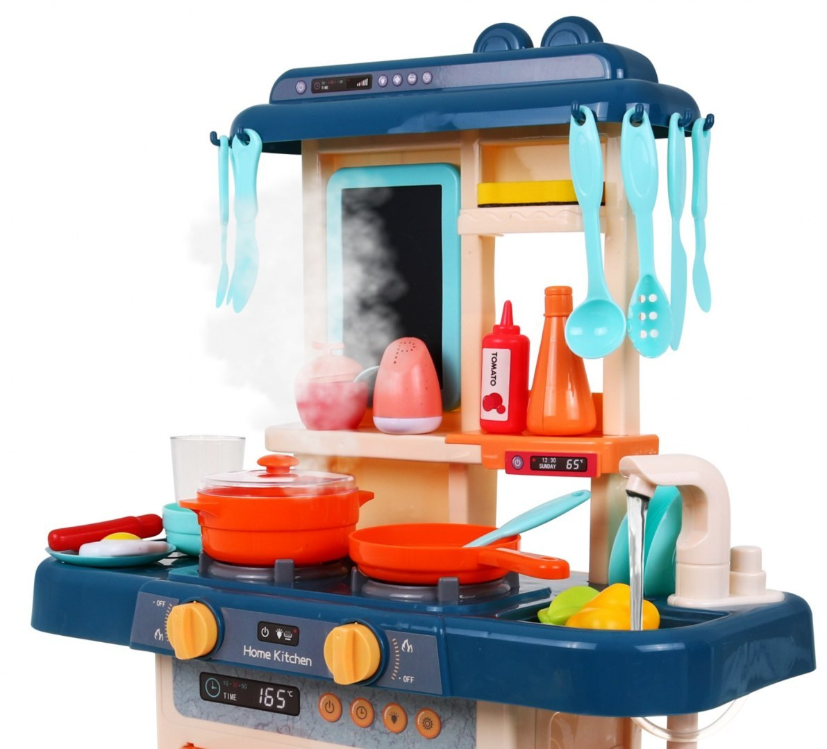 | Kuhinja ima sudoper sa slavinom iz koje teče voda, dva indukcijska plamenika, pomične ručke, otvoreni hladnjak, police, opis i dosta kuhinjskog pribora. Nakon uključivanja plamenika na štednjaku čuju se zvukovi kuhanja i popraćeni su trepćućim crvenim svjetlom. Osim toga, jedan plamenik ima funkciju stvaranja pare. Zanimljivo rješenje je postaviti opisni tekst iznad plamenika. Na njemu možete ispisati popise za kupovinu ili recepte. Cijeli set se sastoji od 42 elementa. Izvrsna izrada, jarke boje, šareno pakiranje. Igračku napajaju 3 x AA baterije (nisu uključene). Igračka za djecu stariju od 3 godine, ima CE certifikat. | |