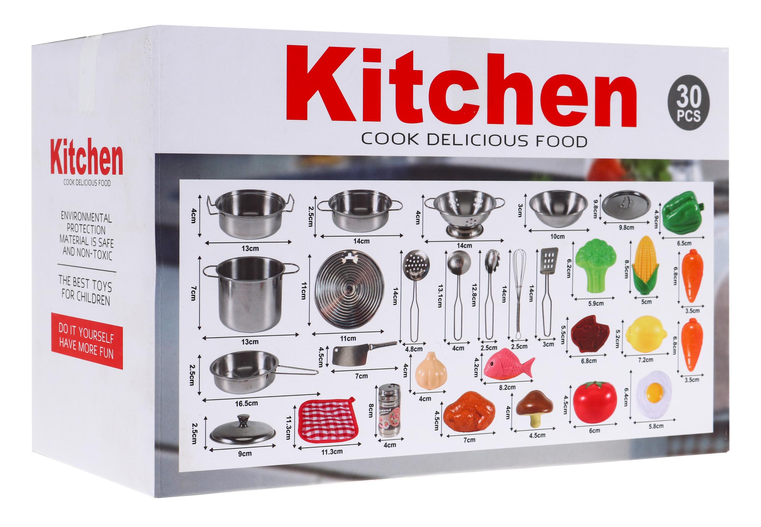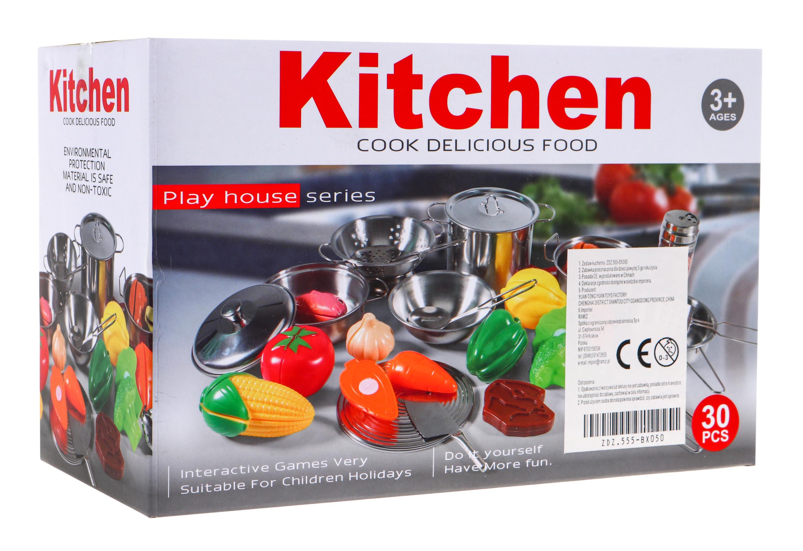 | Kuhinjski set od 30 dijelova namijenjen djeci starijoj od 3 godine. Pribor za kuhanje od metala i imitacije hrane od plastike Djeca vole promatrati okolinu pa se često igraju u trgovini, kući ili kuhinji. Zatim igraju razne uloge, igrajući različite likove. Predstavljeni kuhinjski set može biti savršen način da diverzificirate takvu zabavu. | |