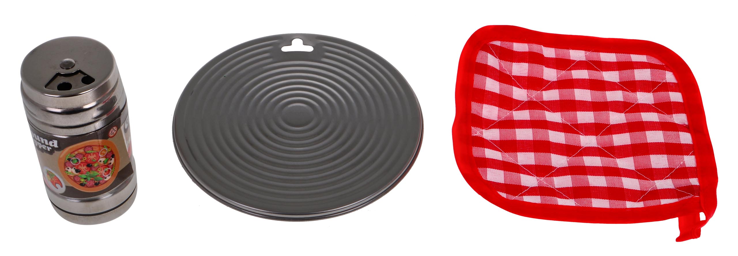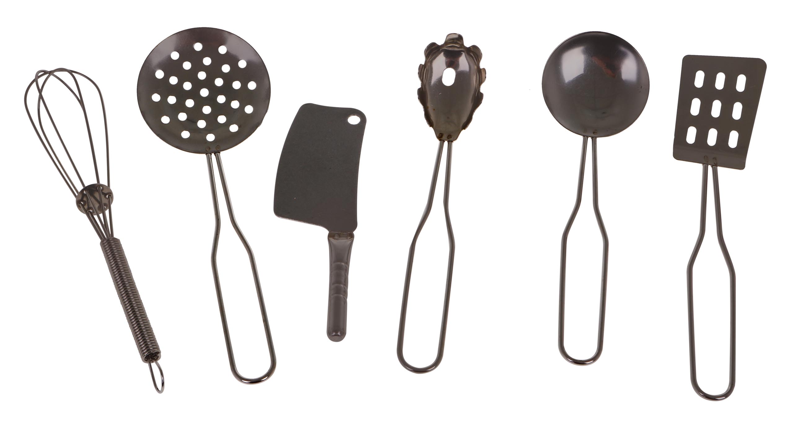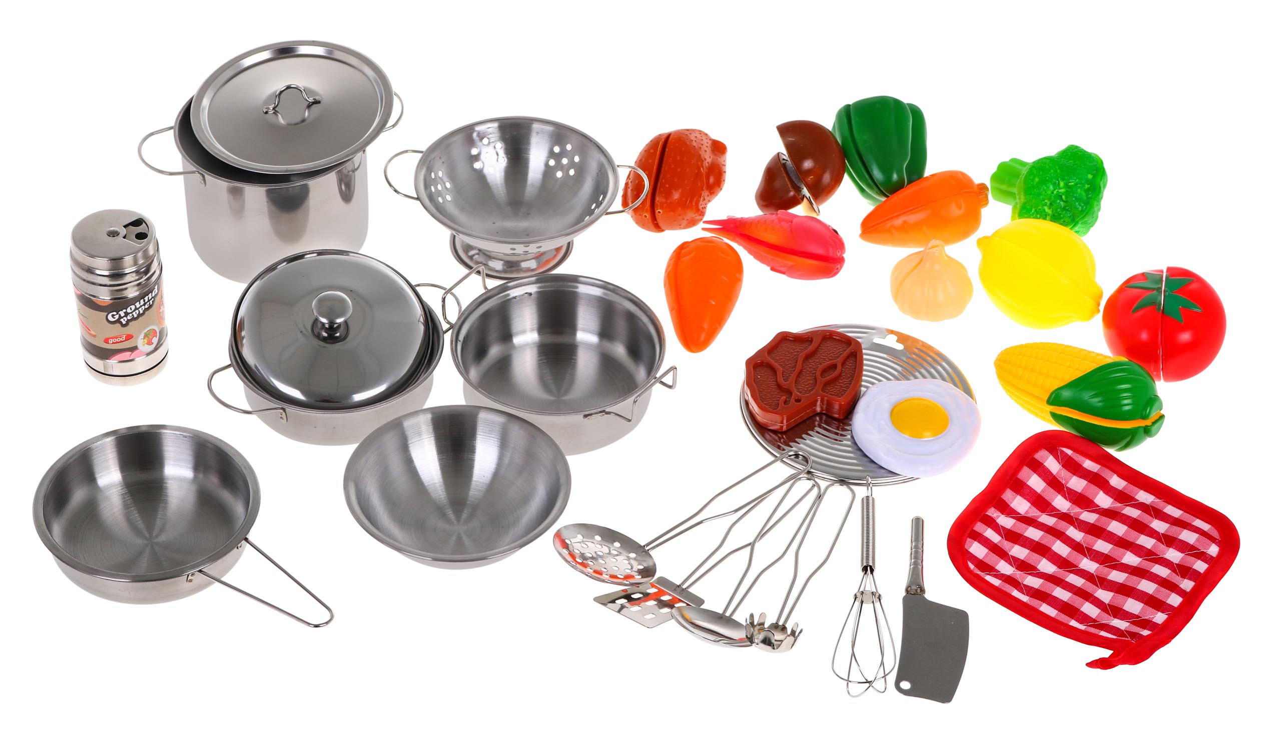 | – metalni lonac cca. 13 x 13 x 4 cm, – metalni lonac cca. 14x14x2,5cm, – metalno cjedilo cca. 14 x 14 x 4 cm, – metalna posuda cca. 10x10x3cm, – metalni poklopac cca. 9,8×9,8,2,5cm, – metalni lonac cca. 13x13x7cm, – metalni stalak cca. 11x11cm, – metalna posuda cca.16,5x10x2,5cm, – metalni poklopac cca. 9 x 9 x 2,5 cm, – metalna šupljikava žlica cca. 14 x 4,8 cm, – metalna kutlača cca. 13,1 x 4 cm, – metalna žlica za tjesteninu cca. 12,8 x 2,5 cm, – metalna metlica cca. 14×2,5cm, – metalna lopatica cca. 14 x 3 cm, – metalni nož cca. 7 x 4,5 cm, – metalna bibernica (sa tri vrste rupa) oko 8x4x4 cm, – materijalni potporanj cca. 11,3 x 11,3 cm, – plastična paprika cca. 6,5 x 4,9 cm, – plastična brokula cca. 6,2 x 5,9 cm, – plastični kukuruz cca 8,5×5 cm, – 2x plastična mrkva cca. 6,8×3,5cm, – plastični limun, cca. 7,2 x 5,2 cm, – plastični odrezak cca. 6,8 x 5,5 cm, – plastično pečeno jaje oko 6,4 x 5,8 cm, – plastična rajčica cca. 6×4,5cm, – plastična riba cca. 8,2 x 4,2 cm, – plastična gljiva cca. 4×4,5 cm, – plastični češnjak oko 4 x 4 cm, – plastična rotisserie piletina 7×4,5 cm. |