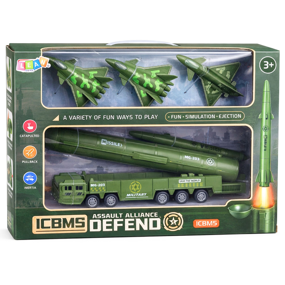 The centerpiece of the set is a military truck with a mobile rocket launcher. The launcher can be adjusted up to 90 degrees, allowing it to be placed in a launch position. The opening lid provides access to the missile, and a button fires it. This feature adds realism to the play and allows for role-playing various military mission scenarios.