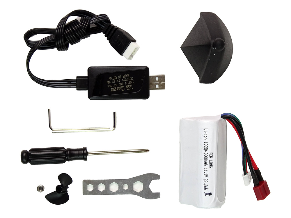 • Set sadrži i dodatke kao što su: kabel za bateriju, ključ, odvijač, stalak za motorni čamac koji će osigurati njegovu stabilnost na kopnu, vijak i dva imbus ključa.