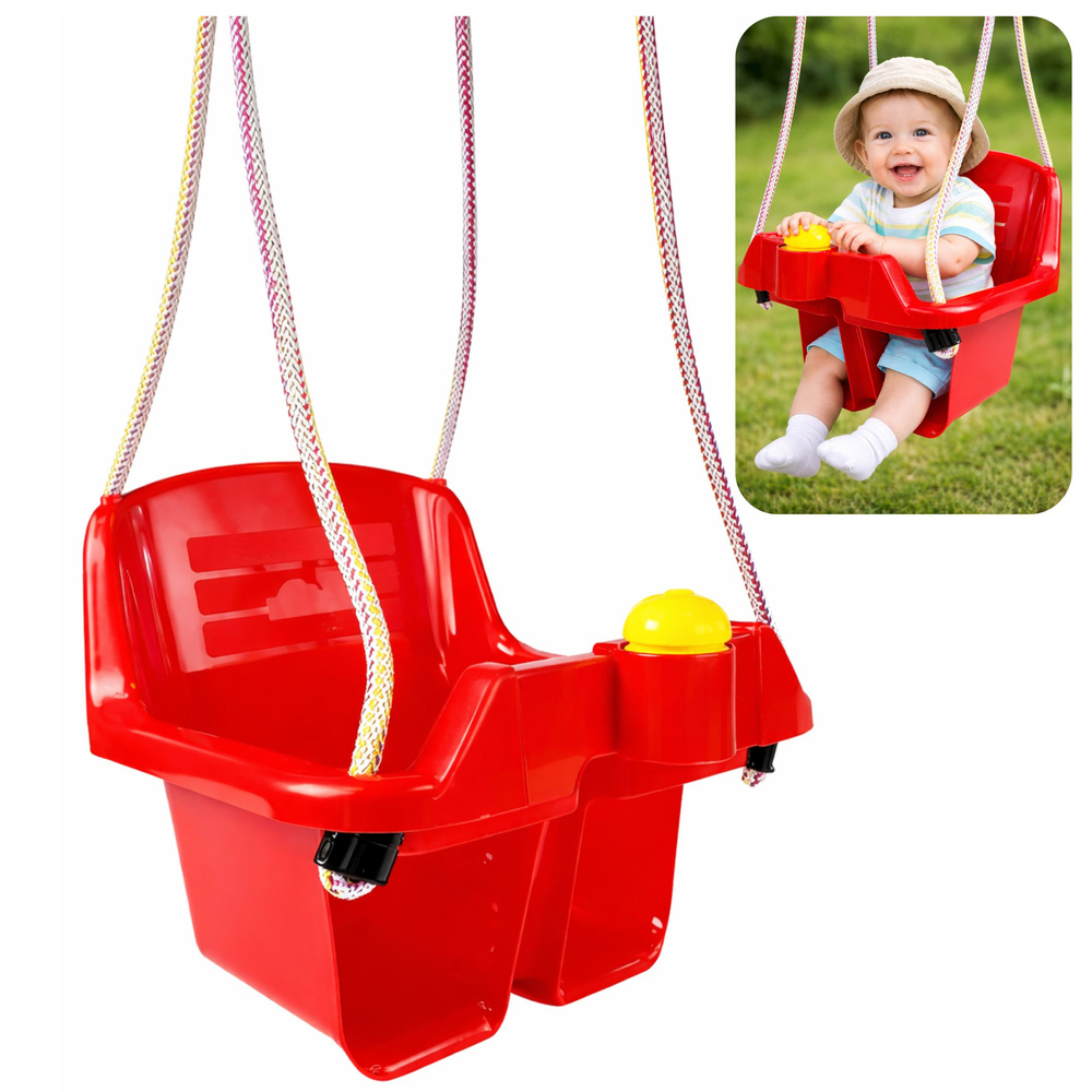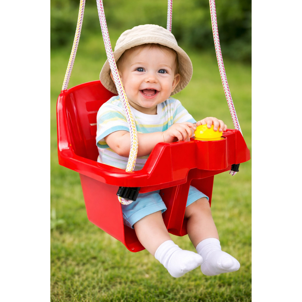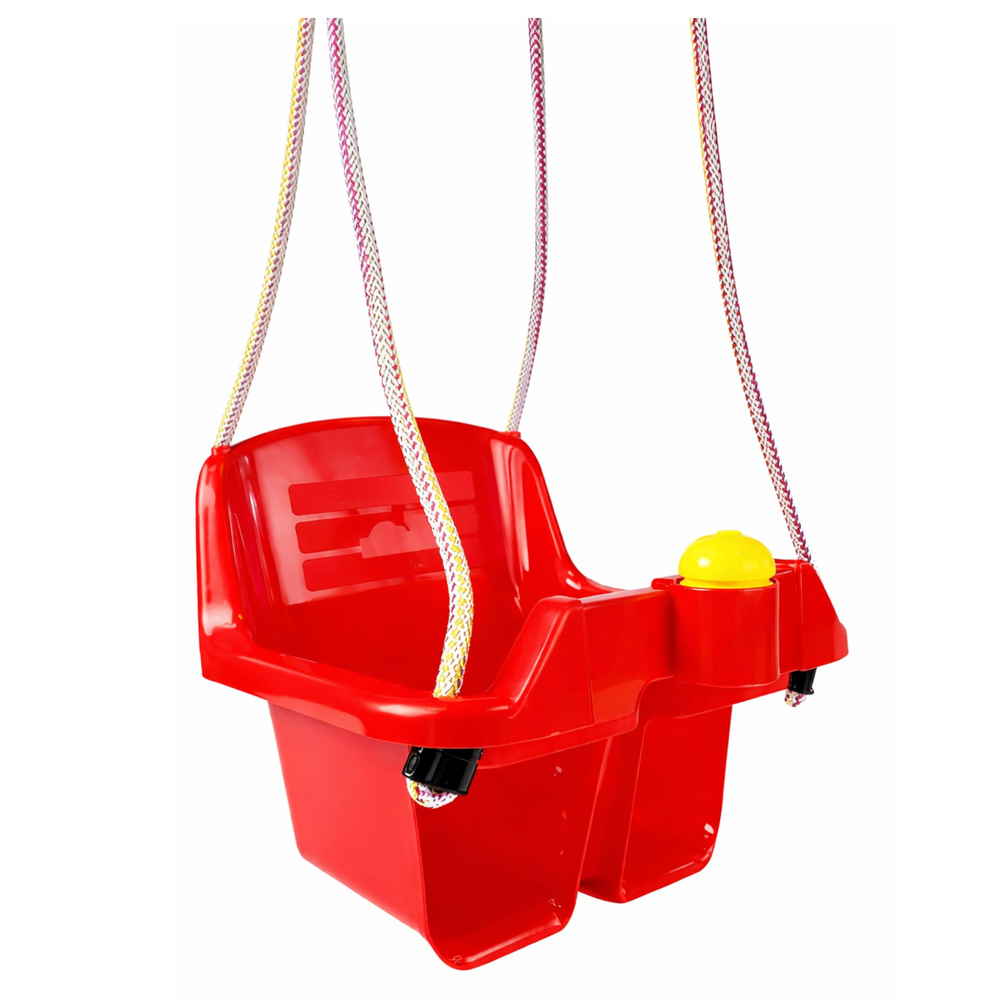 Duboko sjedalo, visoki naslon i prednja blokada osiguravaju sigurnost i drže vaše dijete u pravilnom položaju. Ljuljačka je oblikovana poput sigurne kante, a užad za ovjes su vrlo čvrsta. Možete je objesiti u kući ili u vrtu.