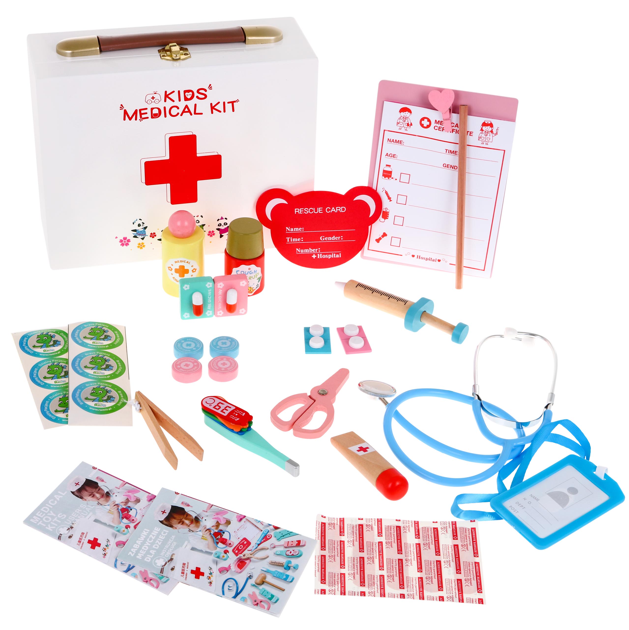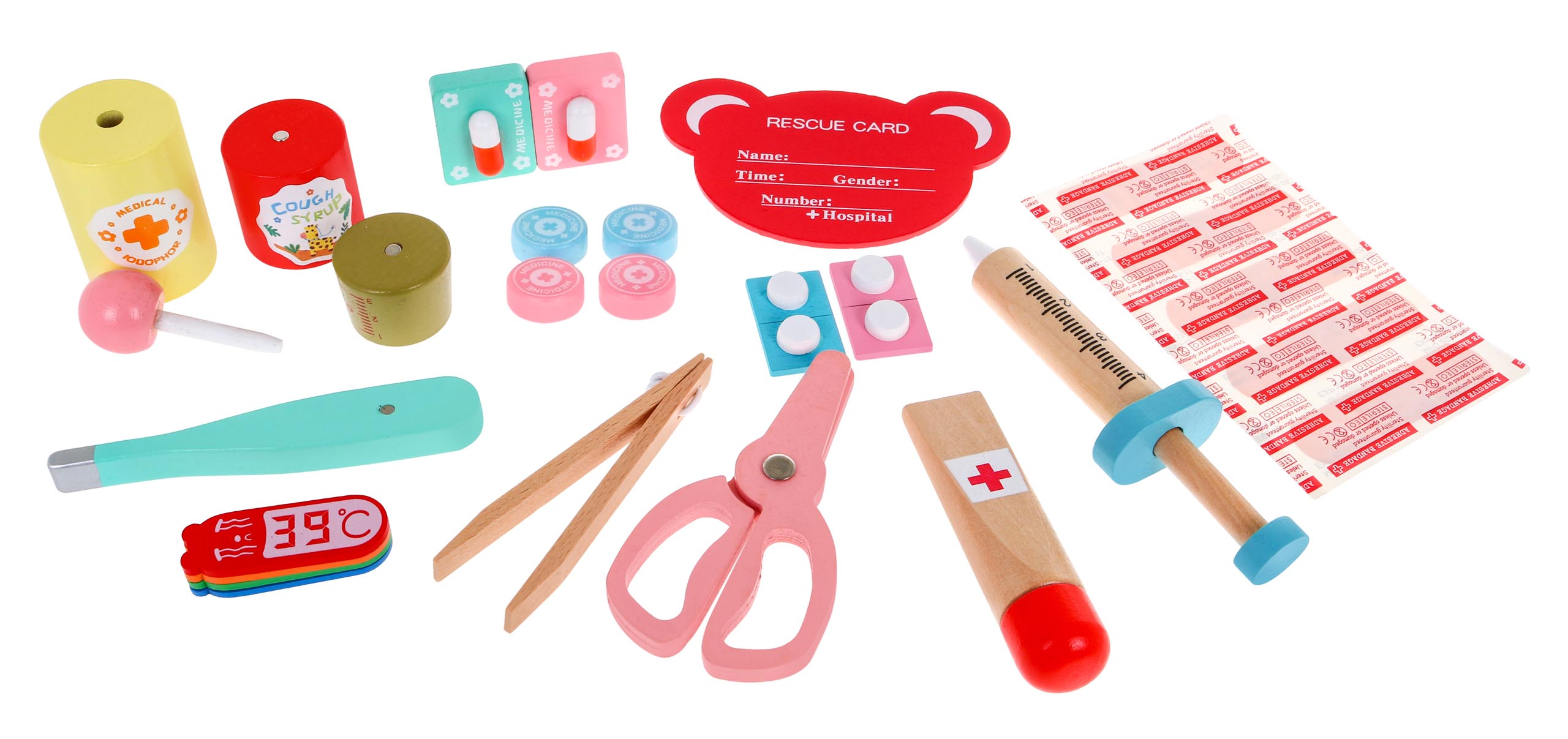 Pojedinačni elementi seta su imitacije pravih medicinskih instrumenata, kojima su dani prijateljski oblici i žive boje.